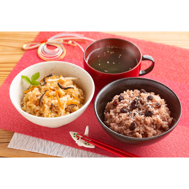 兵庫県のお米、国産のもち米、焼津産のかつお出汁や日高昆布など、国産の原料を中心につくった、おこわのようなもちもちの食感のお赤飯と鶏五目ごはん。お茶碗のようなカップ容器に入っているので、食べたいときにレンジで温めるだけの簡単便利なごはんパック。