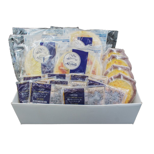 西麻布のイタリアン アルポルトの片岡宏之シェフが監修する、4種のグルメ詰合せ。黒トリュフが香るハンバーグに、クリーミーなポテトグラタンと、2種類のピッツァ。多彩なグルメをお楽しみいただけます。