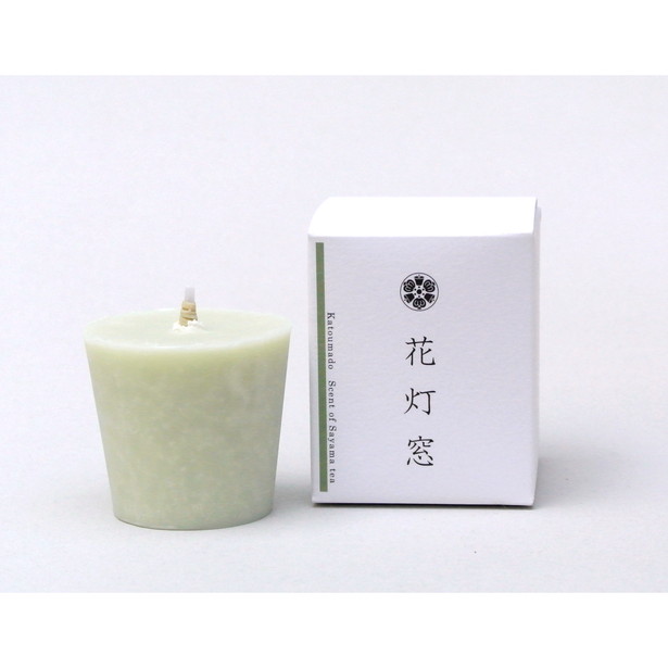 花灯窓には狭山茶の特に香りが豊かに出る部分から抽出した「茶の香り」ロウの中に閉じ込めました。そしてさらに駆り立ての雰囲気が出るようなさやま茶の香りに仕上げています。